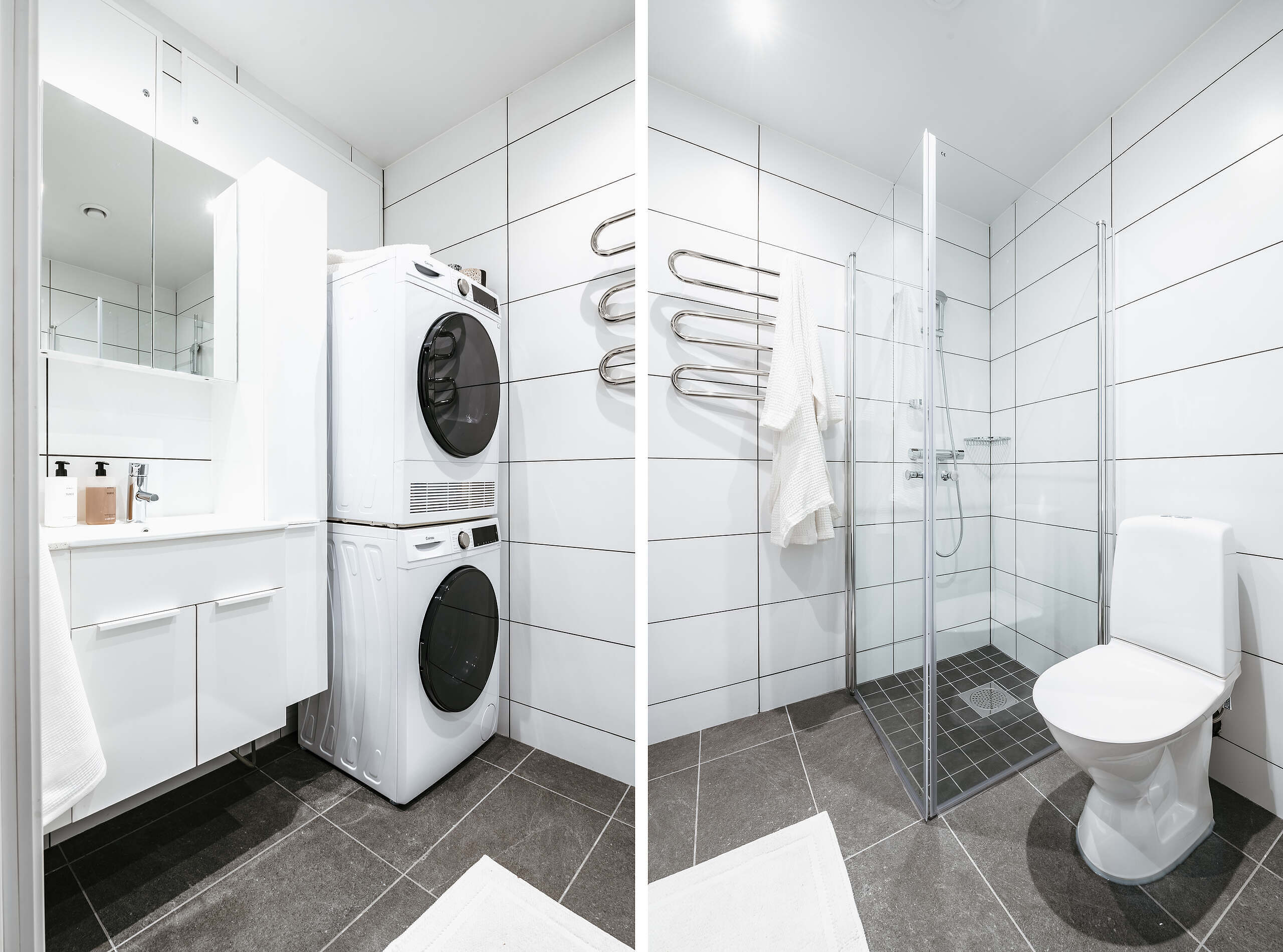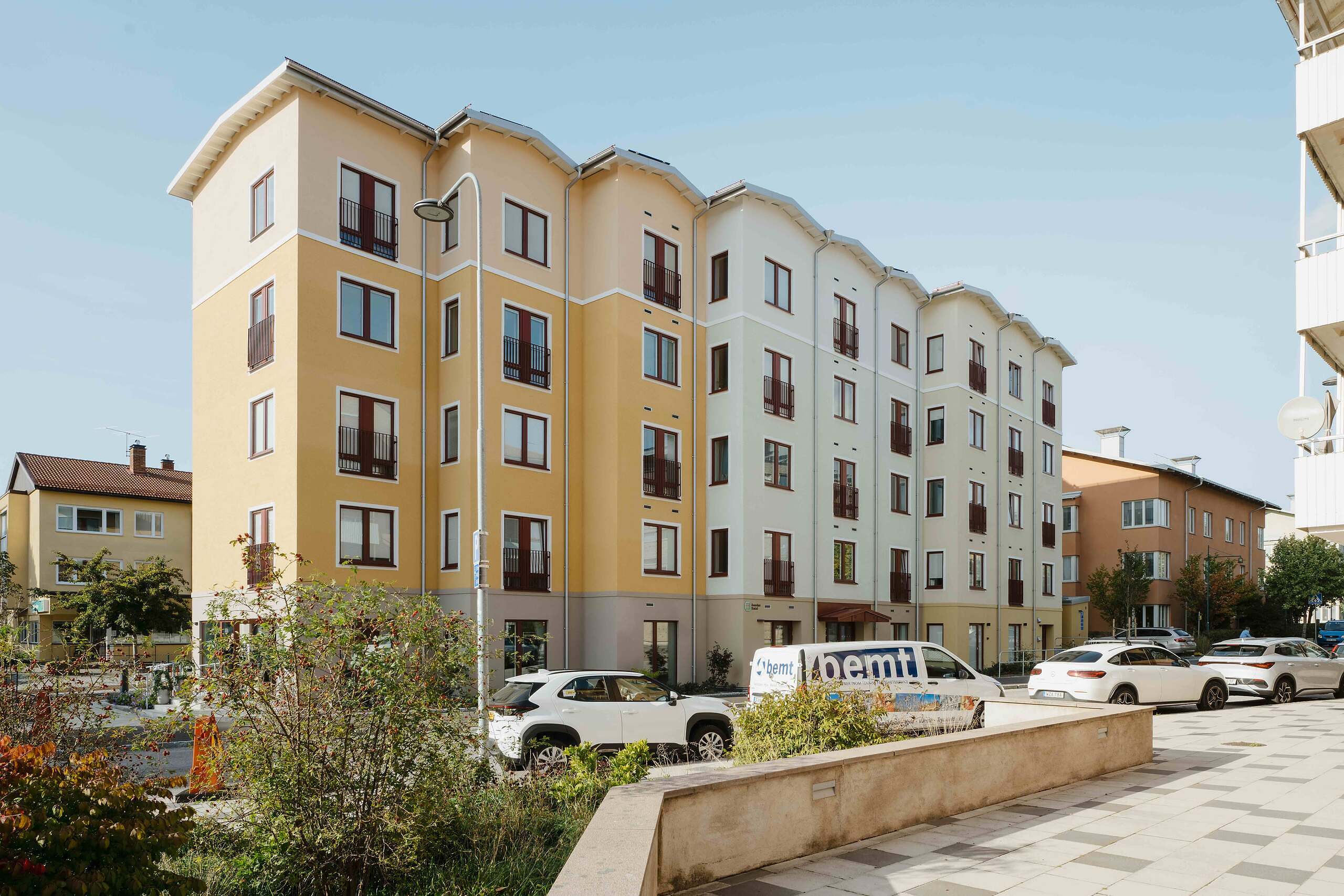 Bostäderna har fina materialval, enstavig ekparkett, helkaklat badrum med kommod och duschdörrar. Tvättmaskin och torktumlare finns i varje lägenhet.